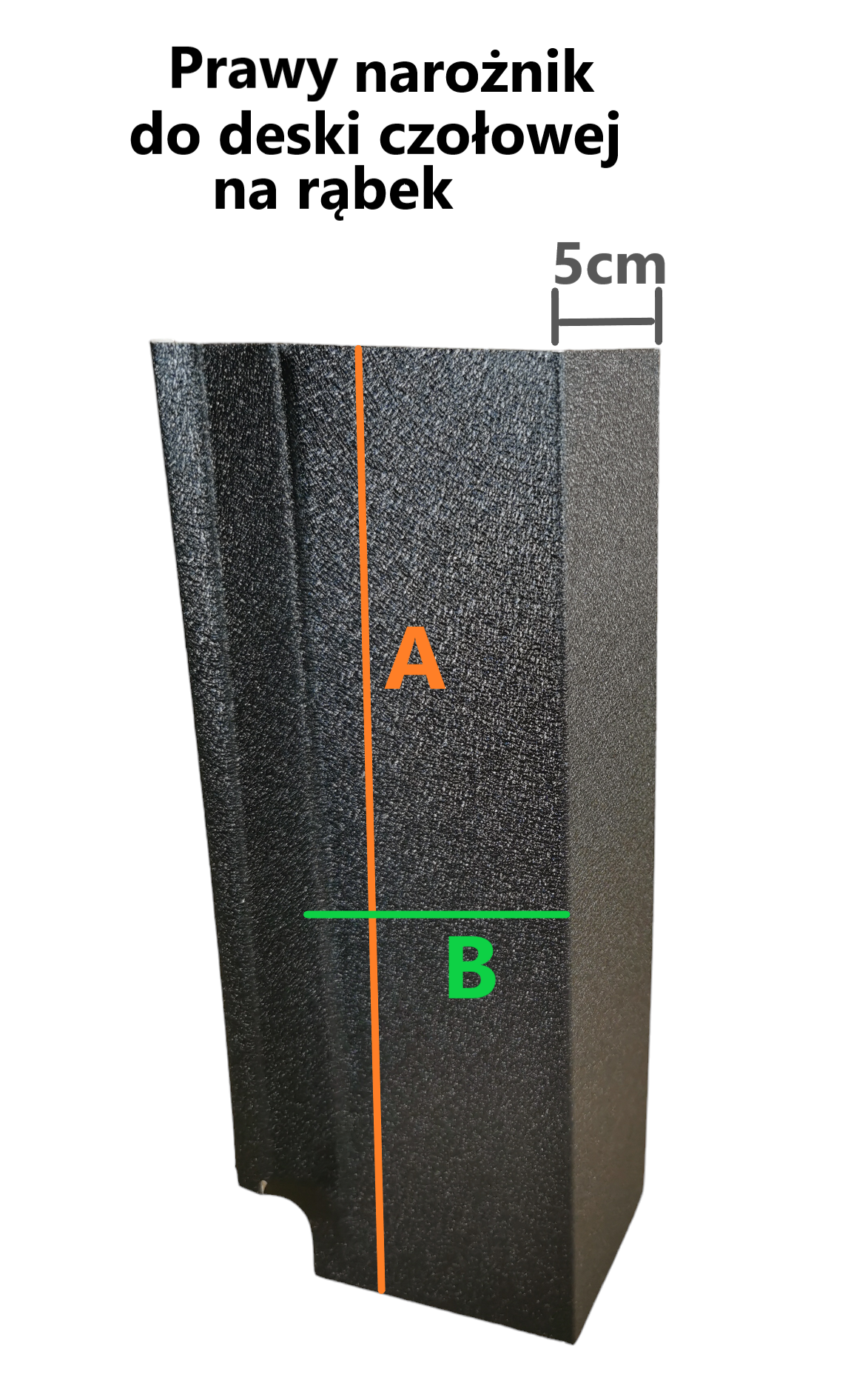 Po zastosowaniu panelu startowego, środkowego do wykończenia prawej strony deski przeznaczony jest narożnik. Jest to element zakańczający, zamykający deskę czołową z prawej strony. Wymiar 5cm na rysunku narożnika nachodzi na krokiew zewnętrzną. Narożnik kupuje się na wybraną długość. Ułatwia to montaż paneli na deskę czołową, minimalna długość narożnika to 1,5cm a maksymalna to 50cm.