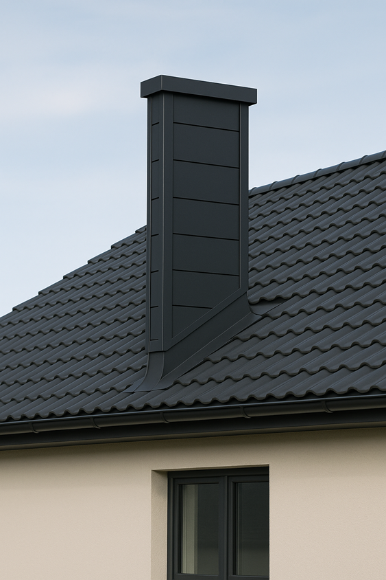 Prawidłowo zamontowana obróbka komina panelami BRH z czapą kominową zapewnia szczelność, trwałość oraz nowoczesne wykończenie komina, harmonijnie dopasowane do bryły budynku.